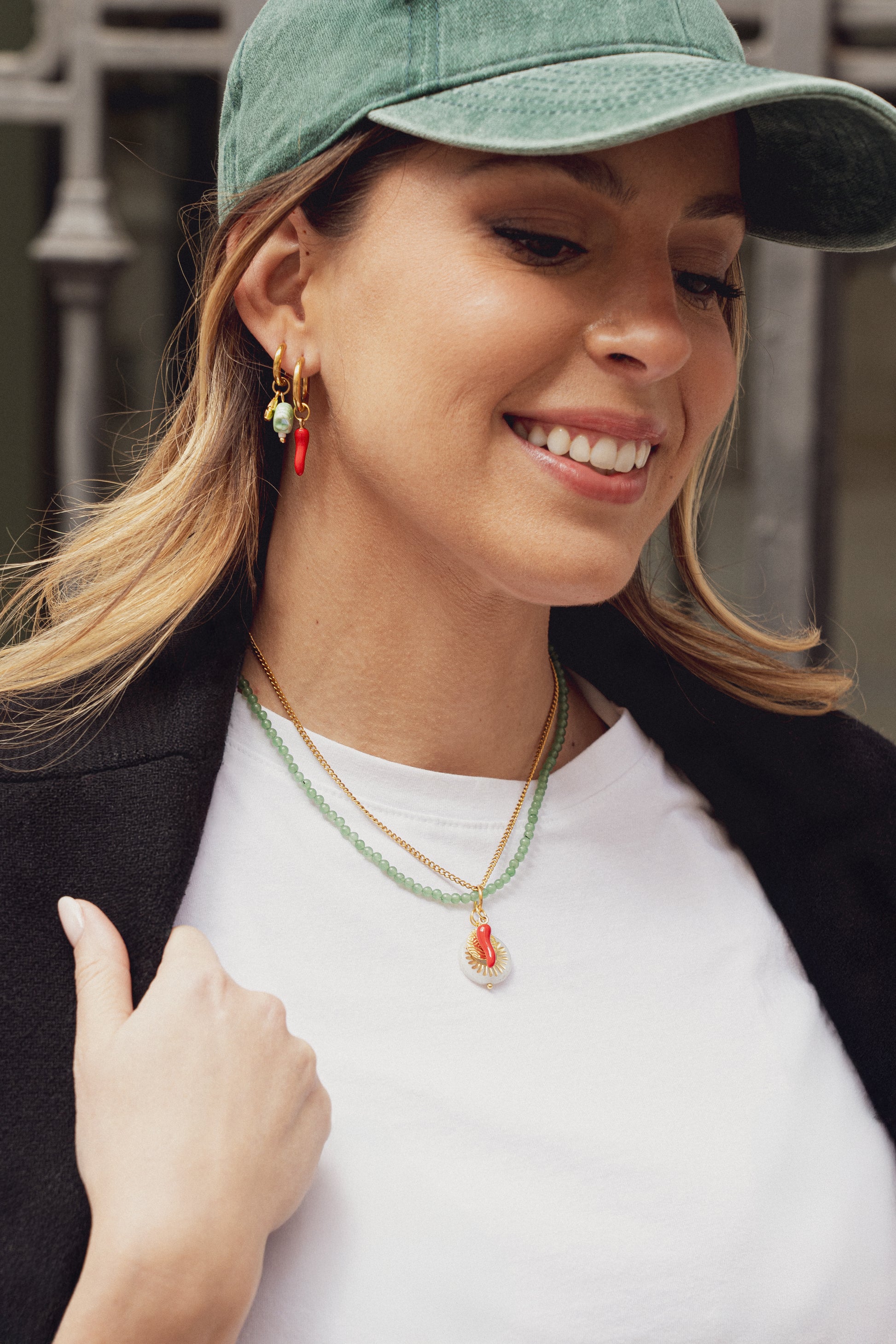 ·Charms: Abalorio redondo de vidrio checo blanco con detalles en dorado pintado a mano, pimiento rojo y charm estrella de mar en latón chapado en oro 18kt.