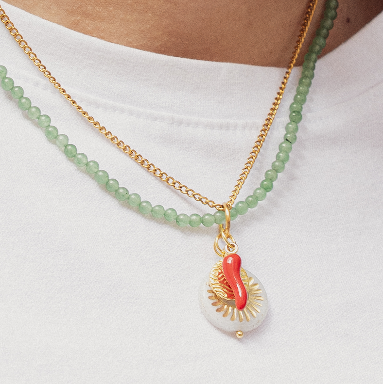 Collar doble con piedras semipreciosas venturina verde, lisas de 3mm, cadena de acero inoxidable chapado en oro 18kt. y colgante con 3 charms.