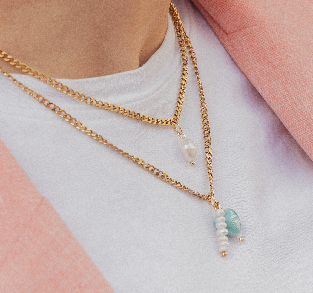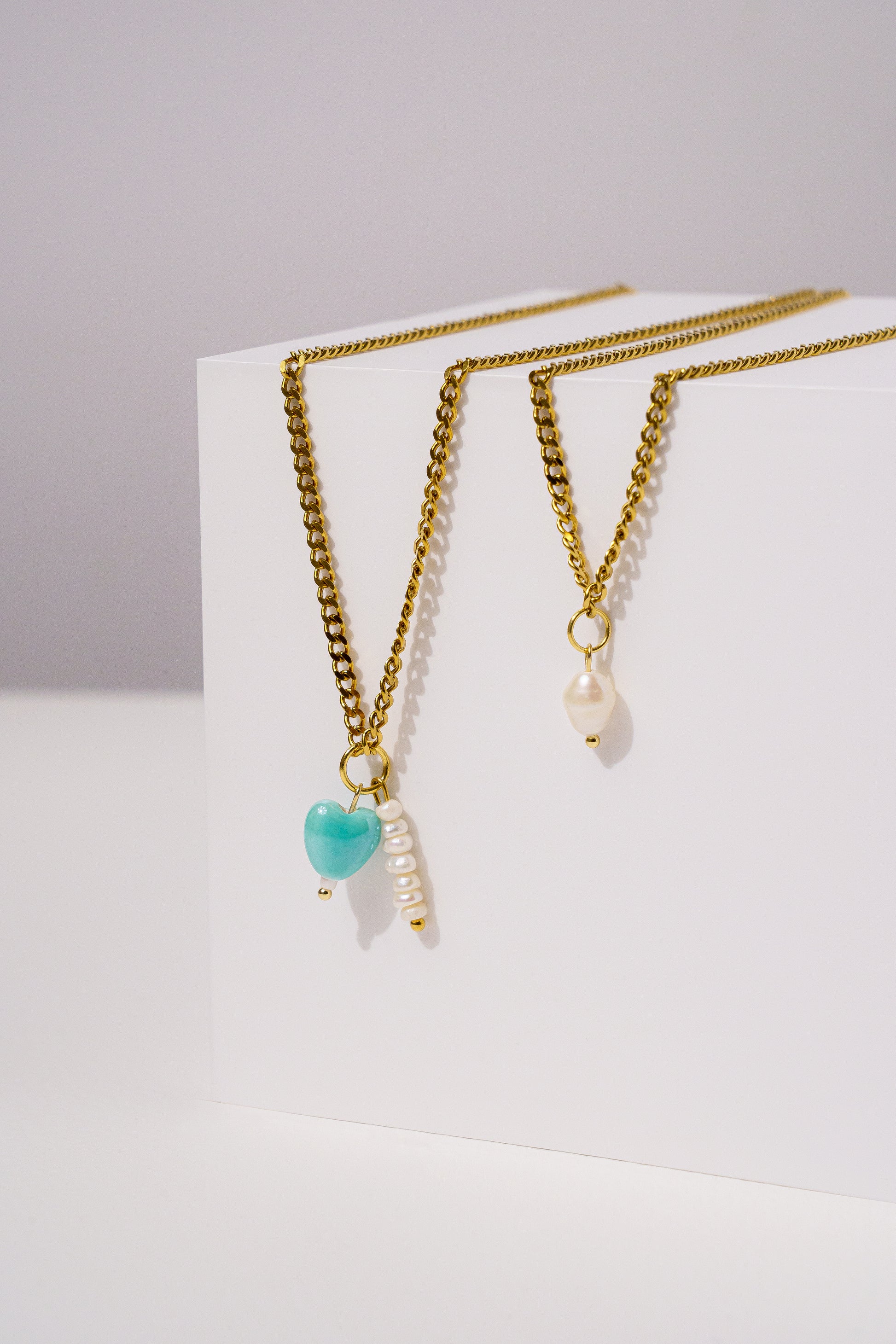 Collar de acero inoxidable chapado en oro 18kt. con colgantes de perlas cultivadas de forma irregular y corazón de cerámica pintado a mano.