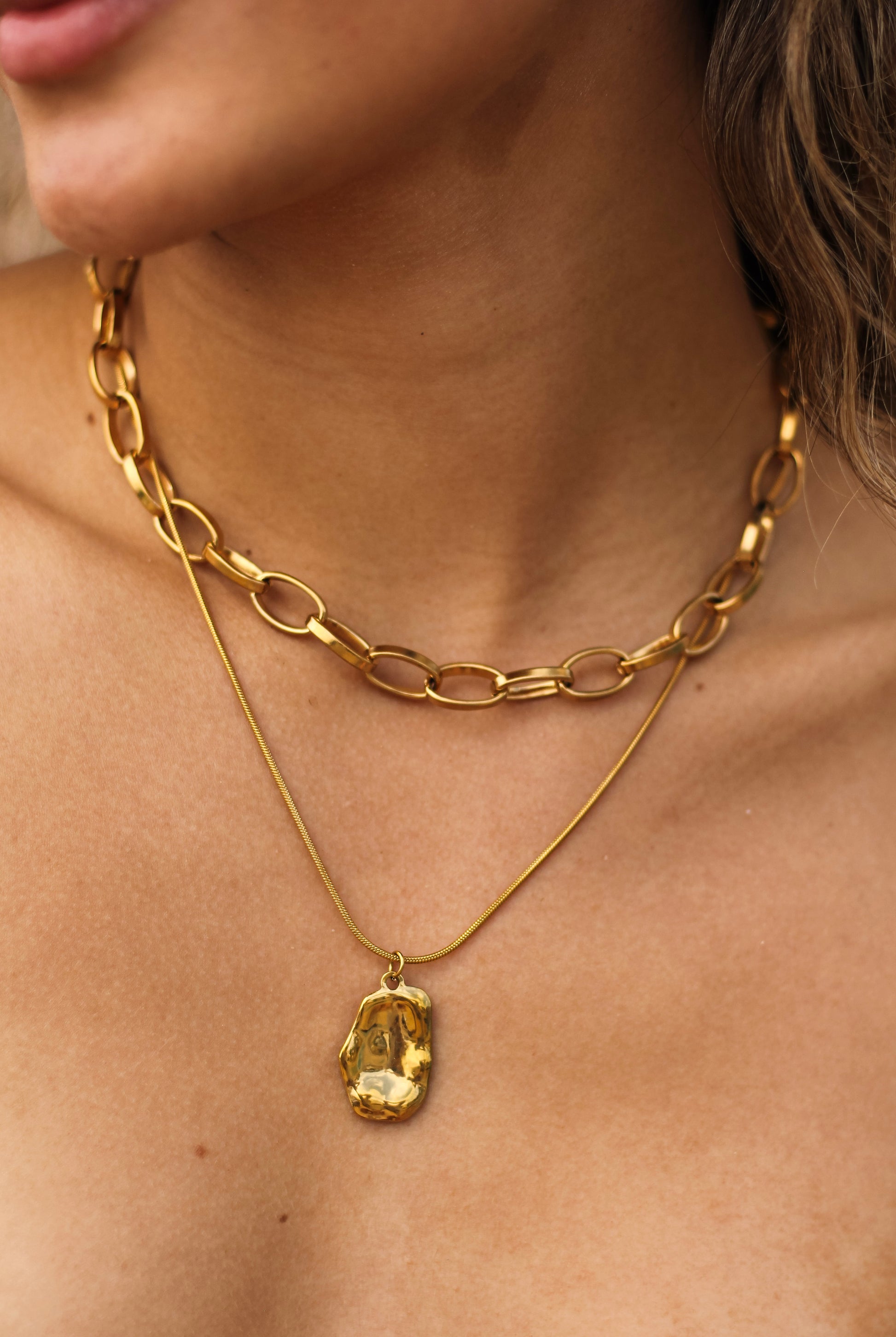 Collar de acero inoxidable chapado en oro 18kt, compuesto por dos cadenas y charm ovalado irregular.