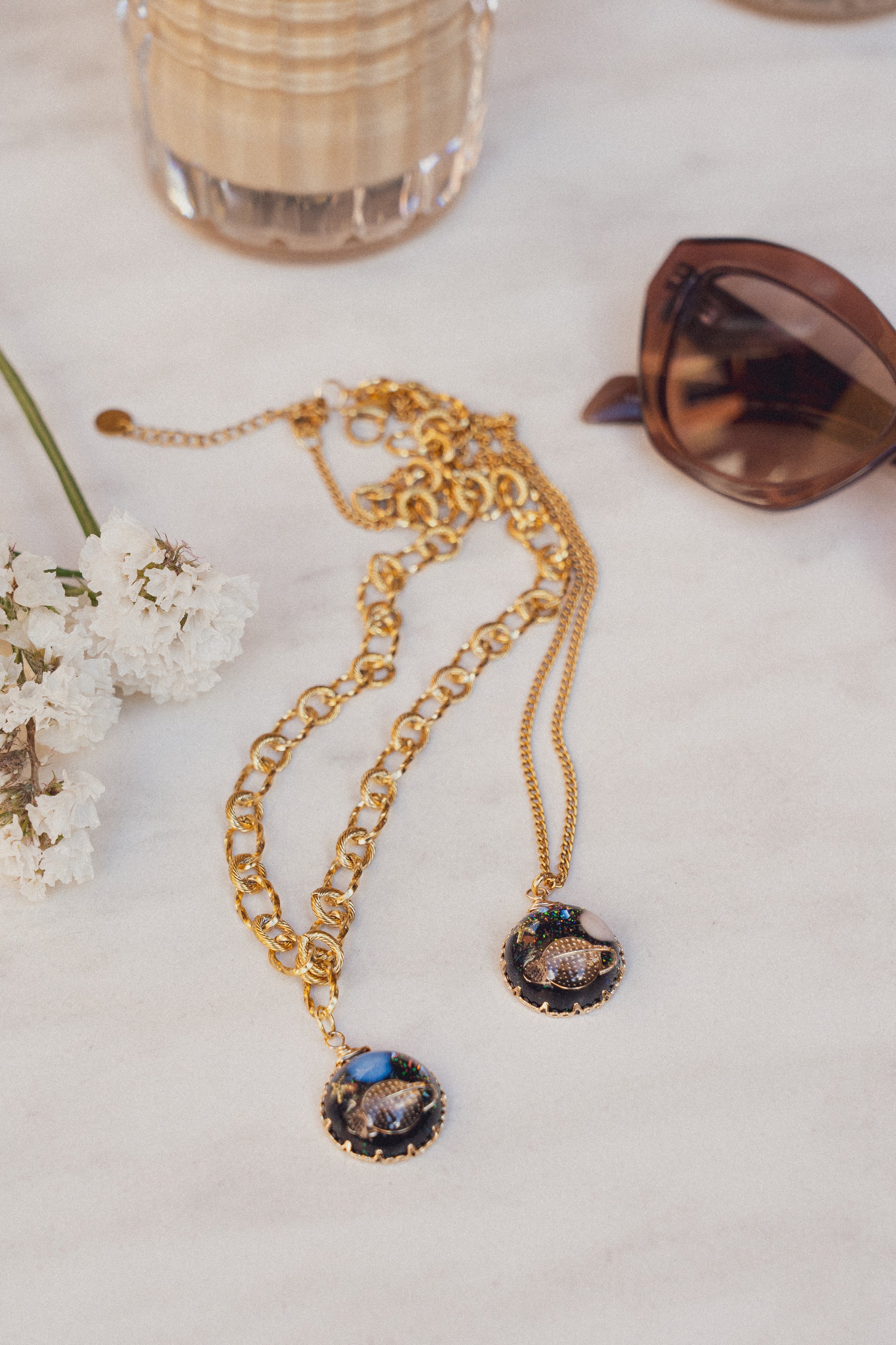 Collar de acero inoxidable chapado en oro 18kt. con charms GALAXIA redondo de resina y latón en color dorado, azul y glitter.