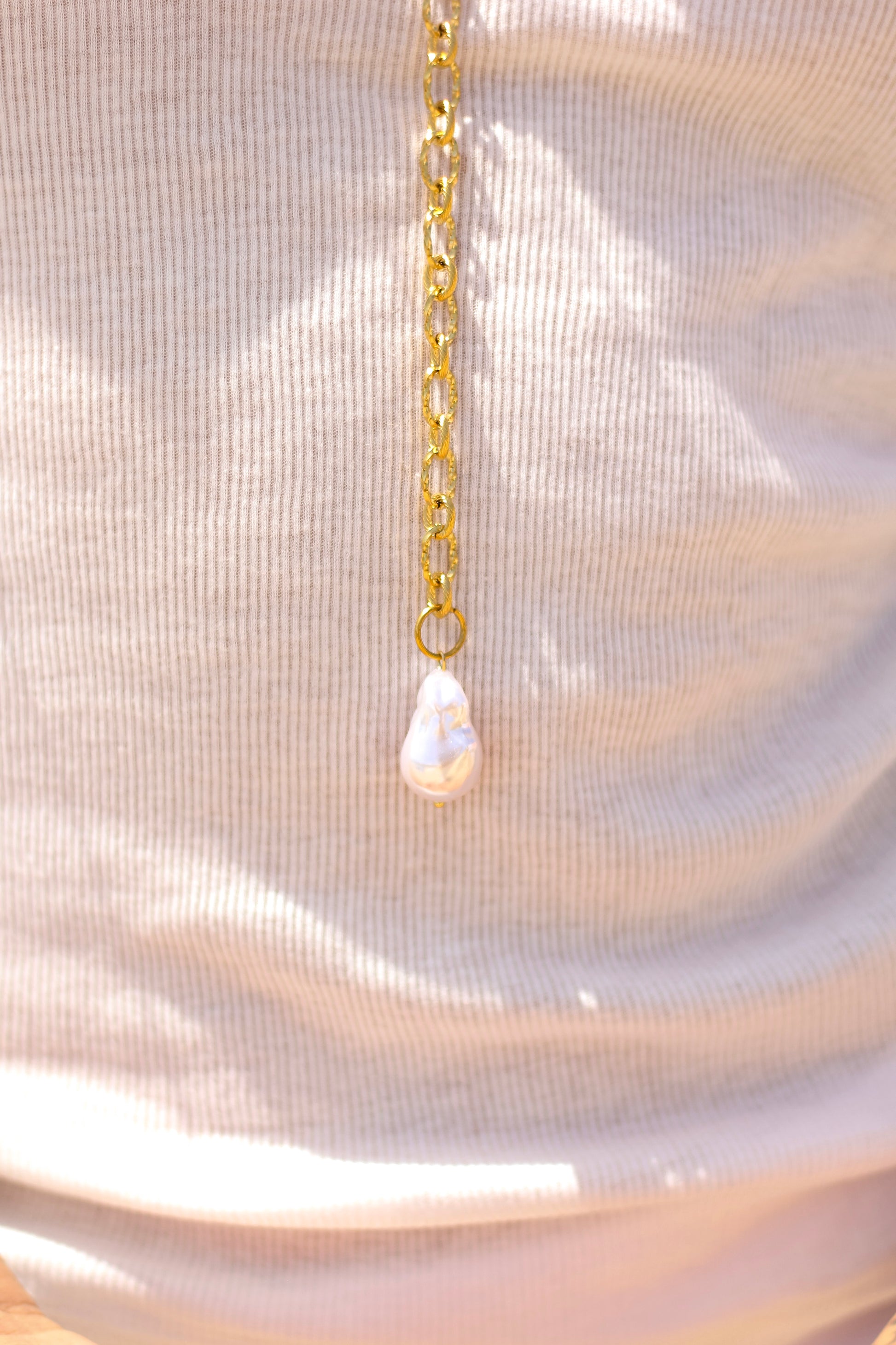 Collar de eslabones grandes en acero inoxidable chapado en oro 18kt. con cuenta de imitación de perla de agua dulce.