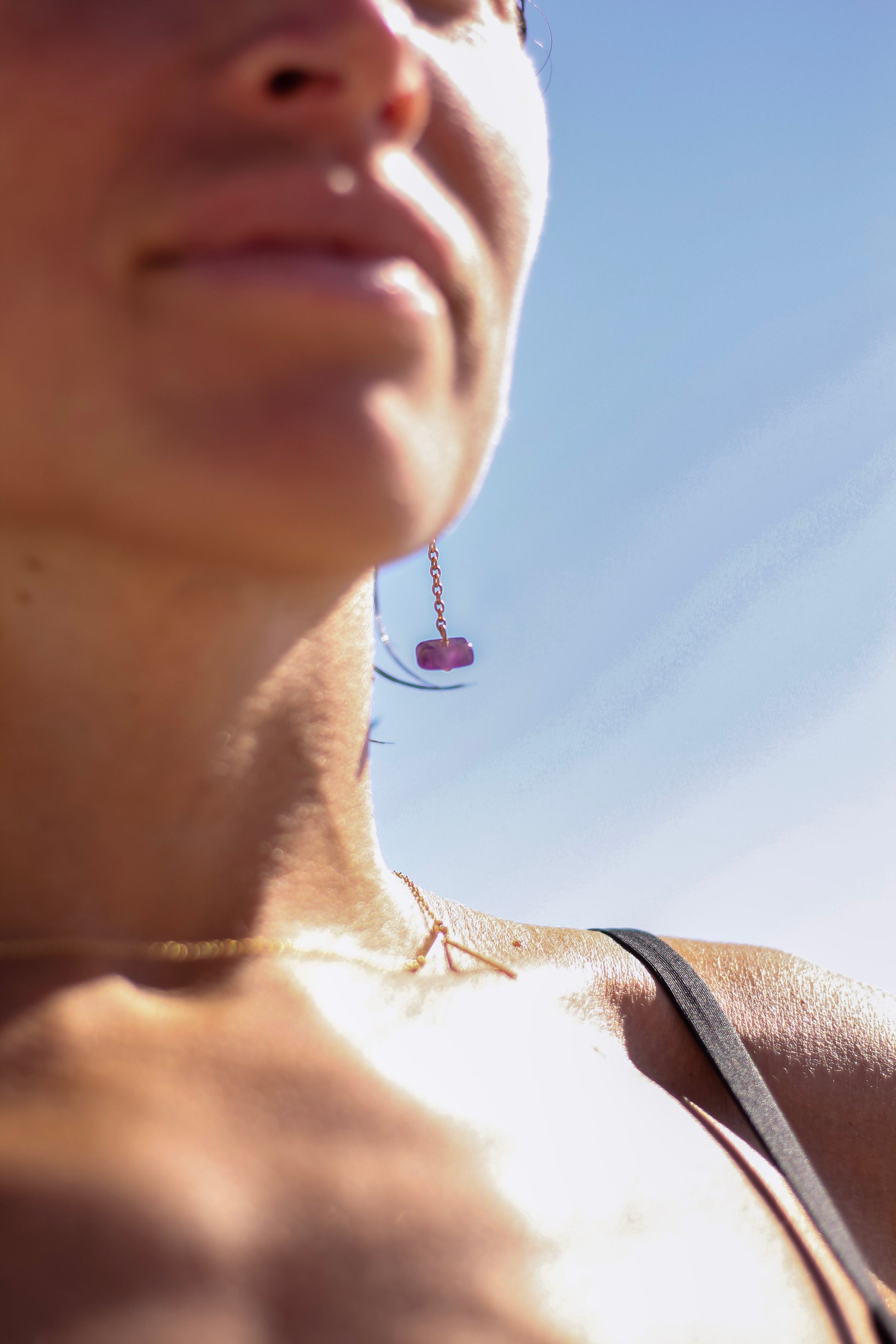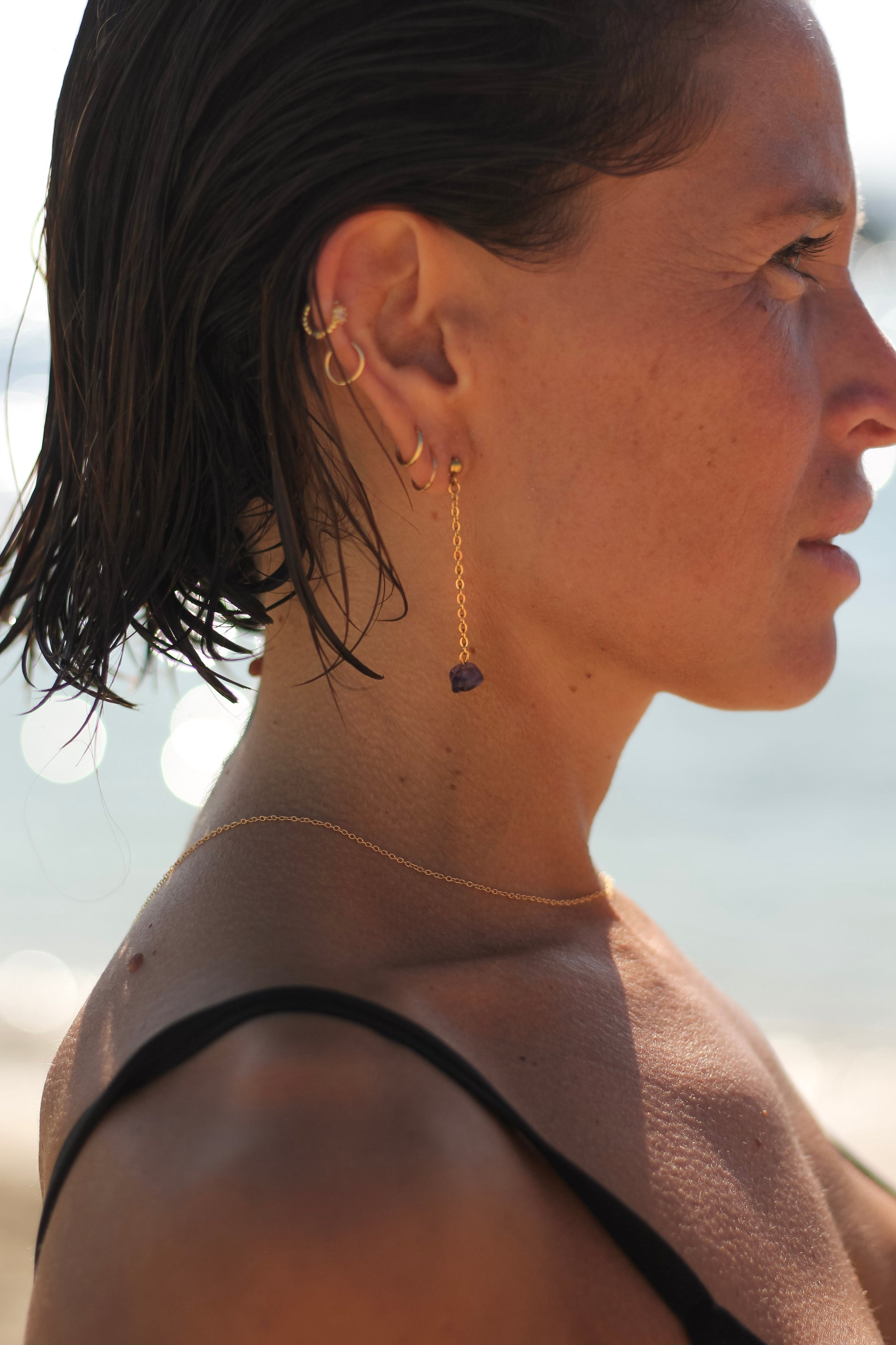 Pendientes de acero inoxidable chapado en oro 18kt. con cadena y cuenta de piedra natural amatista. La piedra es irregular.