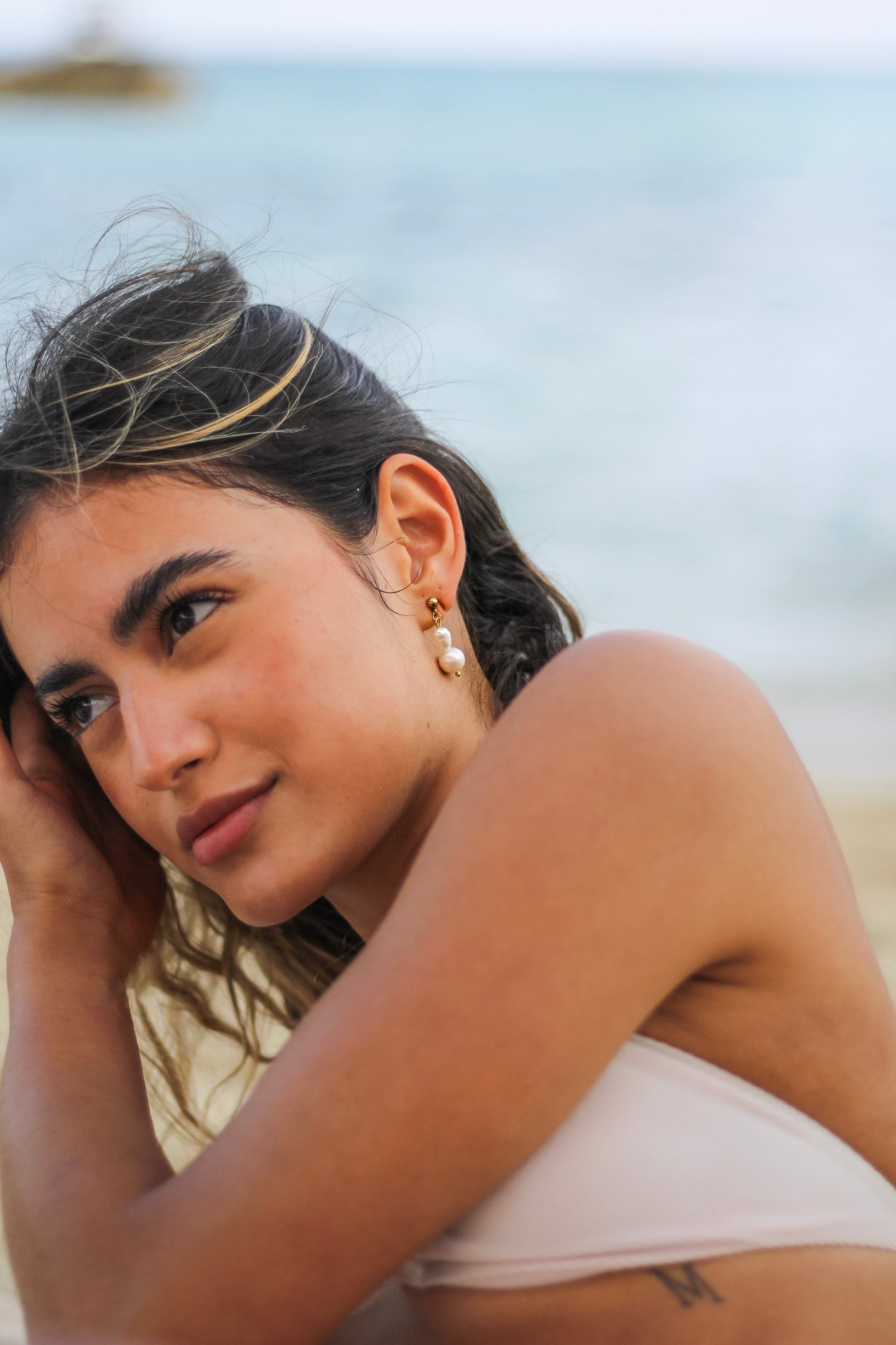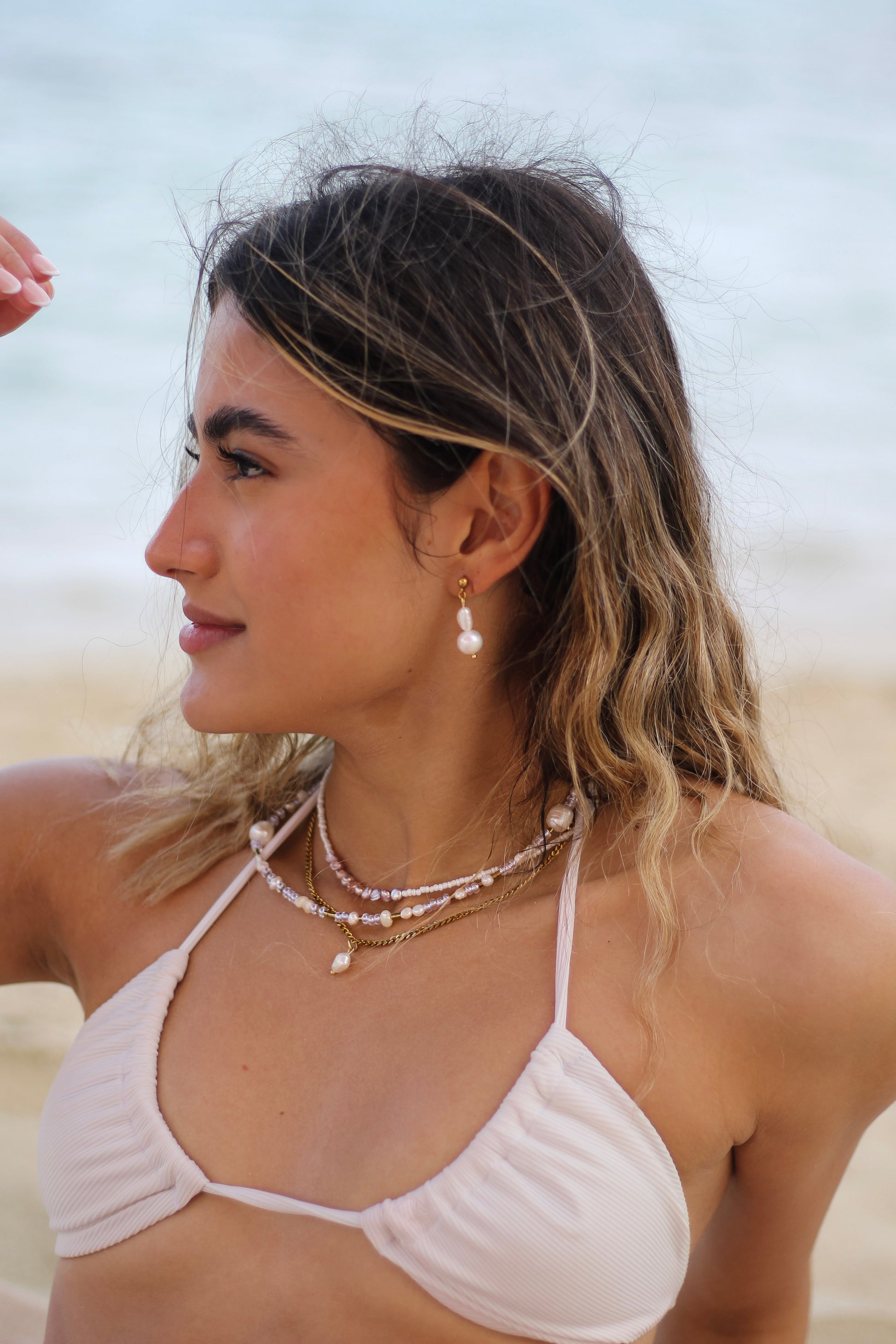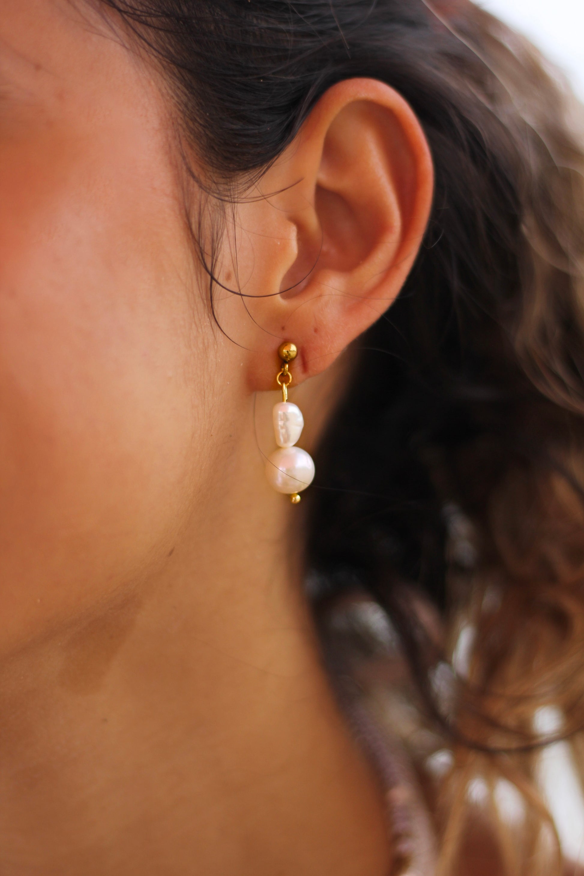 Pendiente de acero inoxidable chapado en oro 18kt con dos perlas naturales de agua dulce de diferente tamaño.